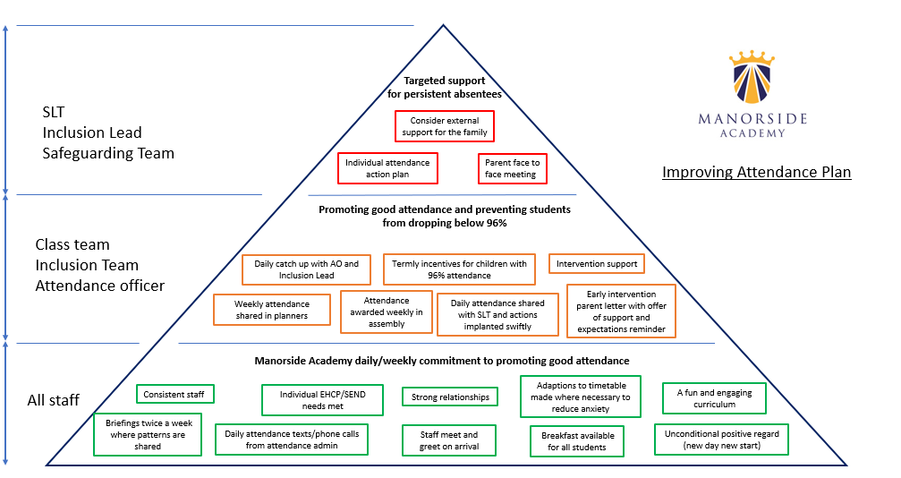 Attendance at school is a legal requirement and it is a parent’s duty to ensure regular attendance at school for their child. At Manorside Academy, we work hard to support parents but we have a duty to report matters of poor school attendance to the Local Authority (School Attendance Worker, 5 to 19 services) at regular intervals. The School Attendance Worker allocated to Manorside Academy works closely with us to monitor and promote regular attendance of compulsory school aged children and will: